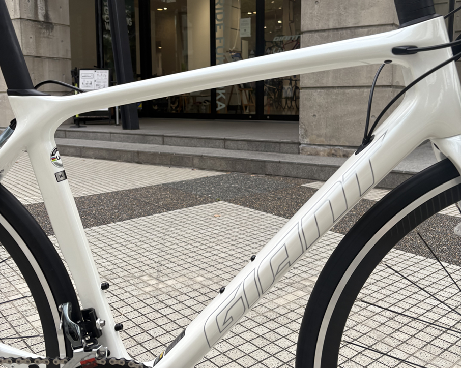 光の角度によって表情が変わり、微かに虹色のニュアンスも漂うユニコーンホワイトのペイントに、金属的な輝きと存在感を放つシャープなアウトラインデザインのGIANTロゴ。洗練された美しさとともに力強さも感じさせる、限定モデルならではのスペシャルカラーが採用されています。