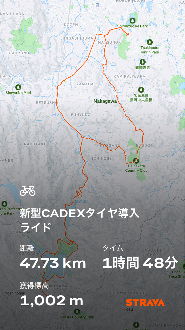 さらに実走では、大博多カントリークラブの登りのセグメントで自己記録を約1分更新し、ストラバでトロフィーも獲得。軽量性とトラクションのバランスが絶妙で、登りのパフォーマンスにも大きな効果を実感しました。
