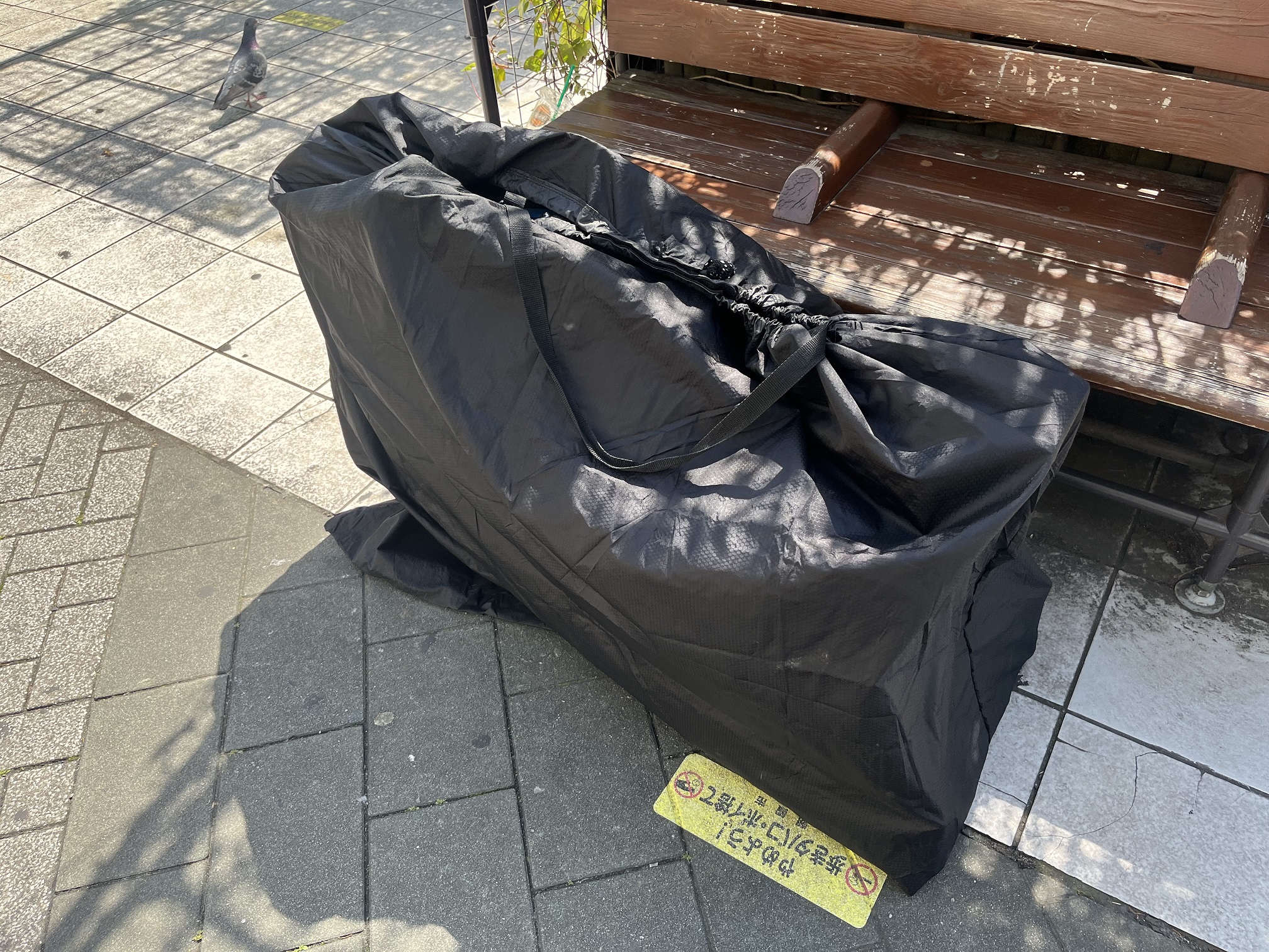 最寄り駅で輪行バッグに自転車を入れ、最端の車両を選んで乗り込みます。