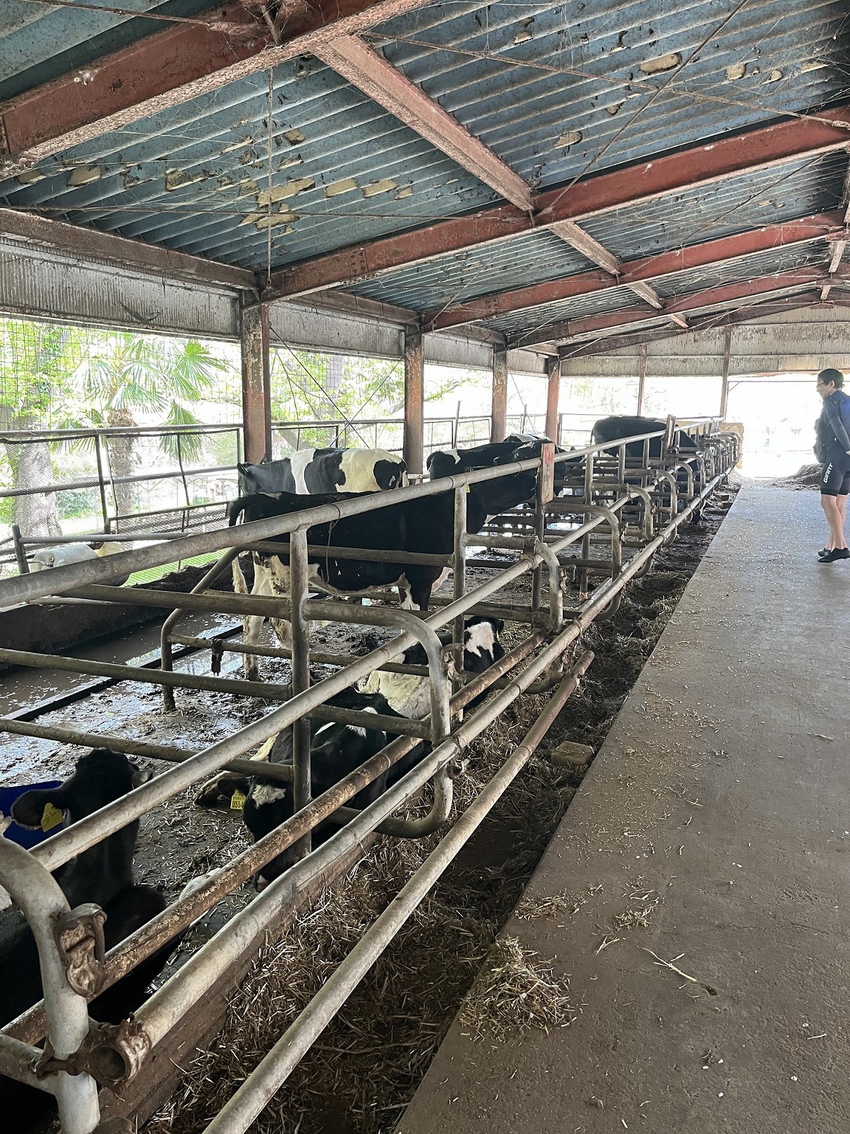 自動の搾乳機械を眺めたりベンチに座ってジェラートを食べながら小休憩。