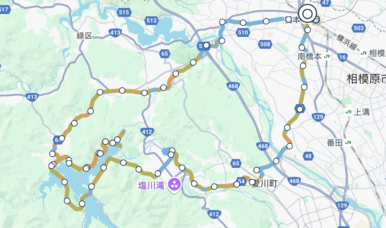 まずは橋本駅から宮ヶ瀬湖畔にあるレストラン「オレンジツリー」を目指します。