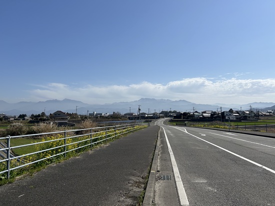 今治市内を抜けて丹原エリアへ。石鎚山をはじめ四国山地にはうっすらと雪が残っています。道端に咲く菜の花と相まって、春らしい風景に心が躍ります。春本番、ソメイヨシノ満開な風景もよいですが、このちょっと春が来たよ〜感のある風景も好きなんですよね。