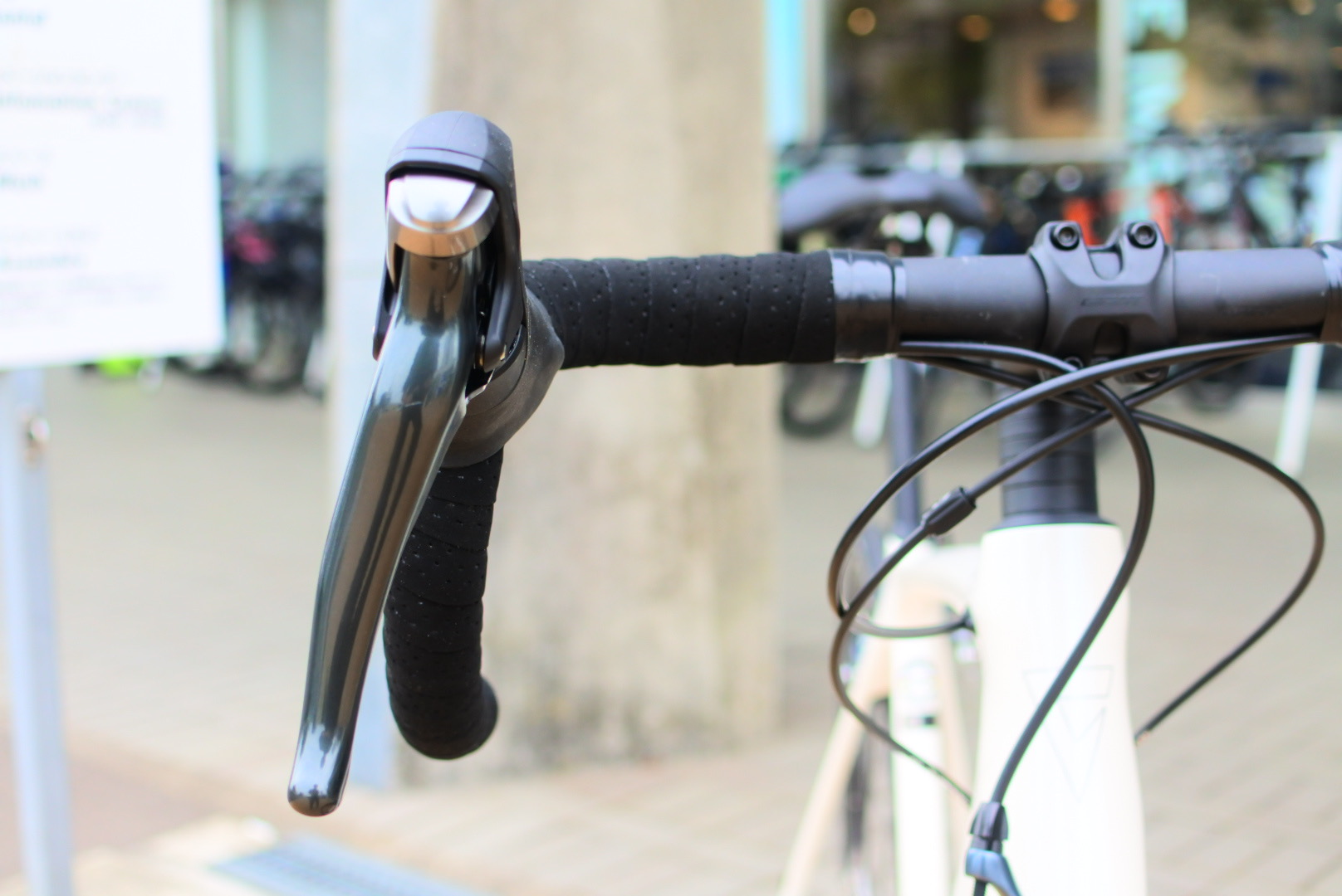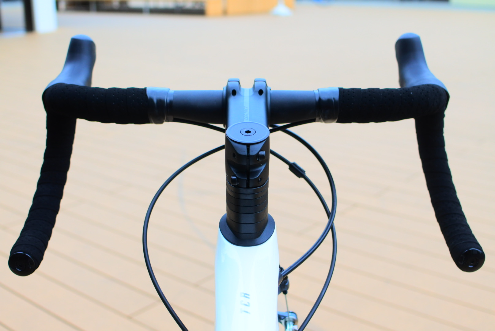 標準装備されているハンドルバーには、昨今トレンドとなっているフレア形状を採用しております。このハンドル、シマノTiagraのスマートなSTIレバーとも相性が良い印象を受けます。