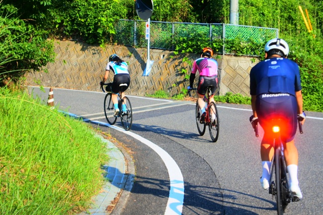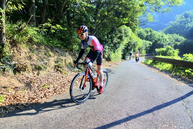 ロードバイクで参加するお客様が多いものの、スポーツバイクであればMTBでもクロスバイクでもご参加いただけます。各々のペースで登りますので、途中で休憩しても大丈夫です。早朝の亀老山は観光バスやクルマもほとんど通りませんので、マイペースでヒルクライムするには非常に良い環境です。