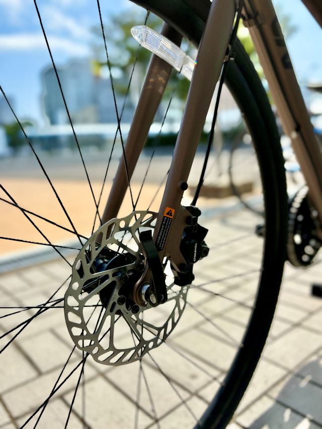 ディスクブレーキを搭載し、フレーム以外は黒で統一されており、すっきりした印象です。