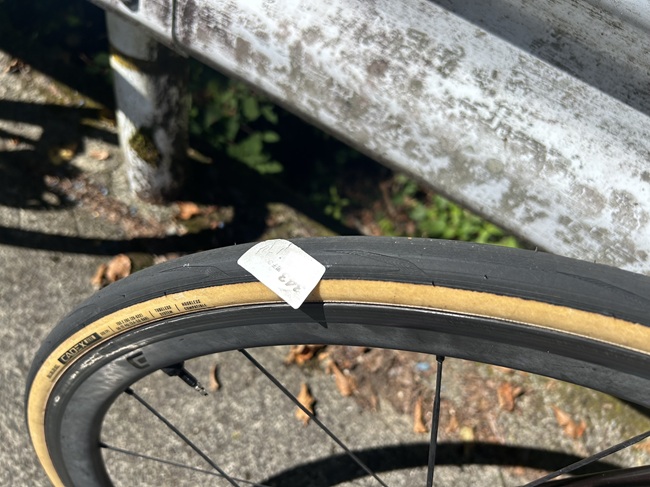 前の年代別クラスでスタートした選手が落とした計測タグシールをフロントタイヤで拾ってしまうあるある。ホイールが回転するたびにペチペチと音が鳴って少々気になります。ちなみに自分のシールも剥がれていたので、誰かのタイヤでペチペチしていたかも。