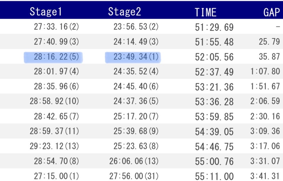 なお、第2区間で感じたゾーン状態ですが、区間タイムで見比べてみると一目瞭然ですね。もう少し貪欲に踏んでいれば、あと少し上のリザルトを得られたかもしれませんが、そんなちょっと勝ちきれないところも自分らしいなと振り返ります。