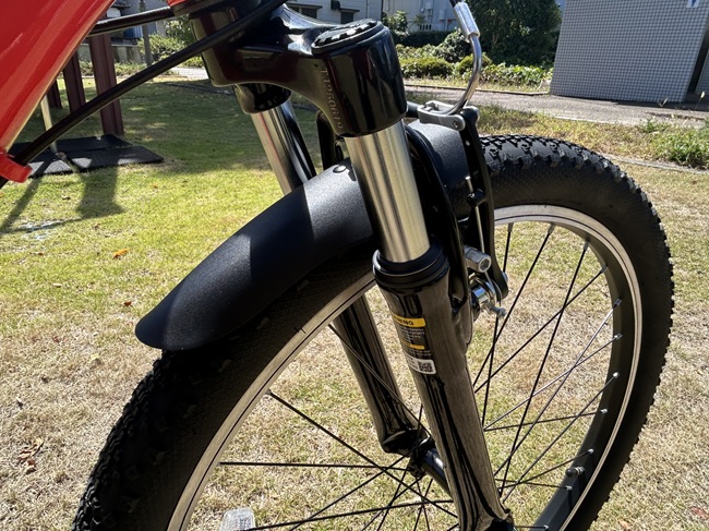 フロントサスペンションフォークには、小さめのマッドフェンダーを標準装備しています。