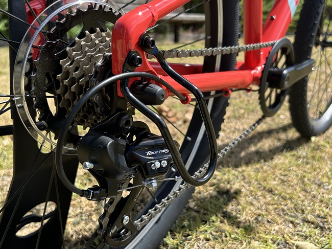 変速機はシマノTourneyの7段変速を採用しています。ディレイラーガードも備えていますので、ちょっとした転倒などの衝撃から変速機を保護してくれます。