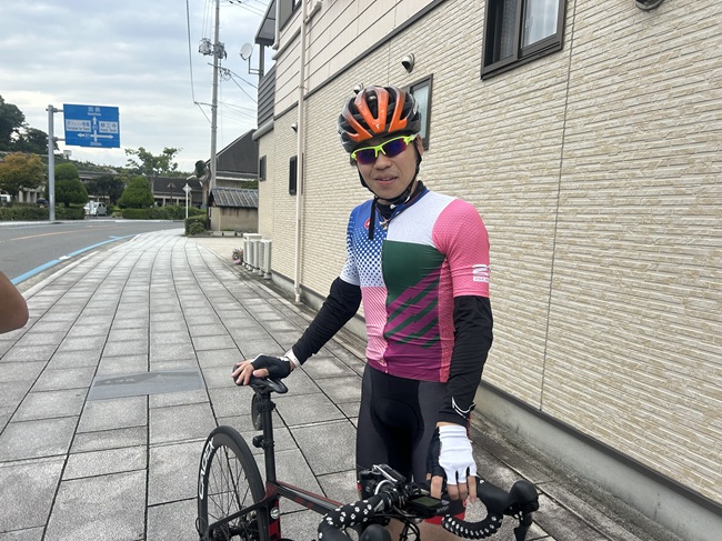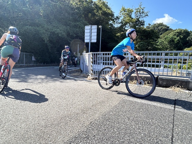 まだまだ元気なスタッフ清水。ライド後半の余力を考慮して、序盤から平坦路の走行速度を25km/h程度でコントロールしていますが、この調子ならもう少しペースアップできるかも。