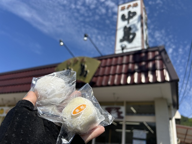 生口島を通過して因島に上陸しましたらスイーツを食します。なお、こちらのお店では「はっさく大福」を11月頃から販売開始ということ。今回はシャインマスカットと金柑大福を購入しました。ちなみにこの2つはお土産用です。