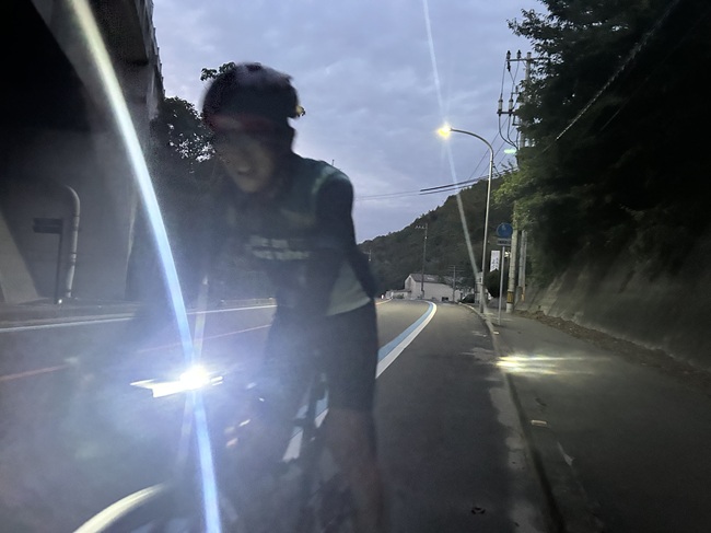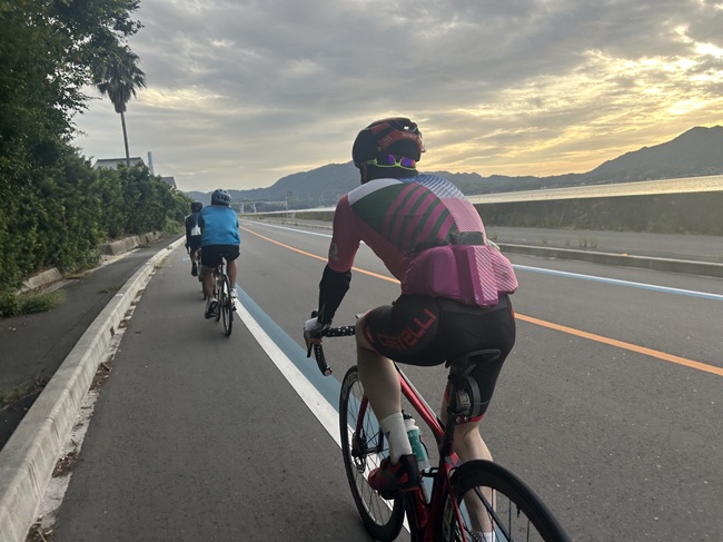 生口島に入ってすぐのコンビニで休憩後、様子を見ながら少しだけペースアップ。平坦路を30km/hあたりで走行しながら、沈む夕日を追いかけるように今治を目指します。
