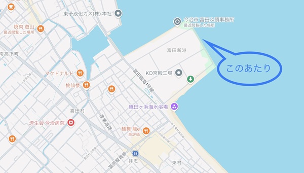 この日、私たちが釣りに出かけた場所はこちら。今治店からもほど近い、ローカルでは定番の釣りスポット「富田新港」です。こちらには大手食品メーカーの宮殿工場もございまして、工場の近くを通ると焼肉のタレの美味しそうな香りが漂ってきます。