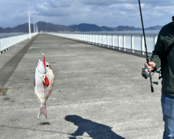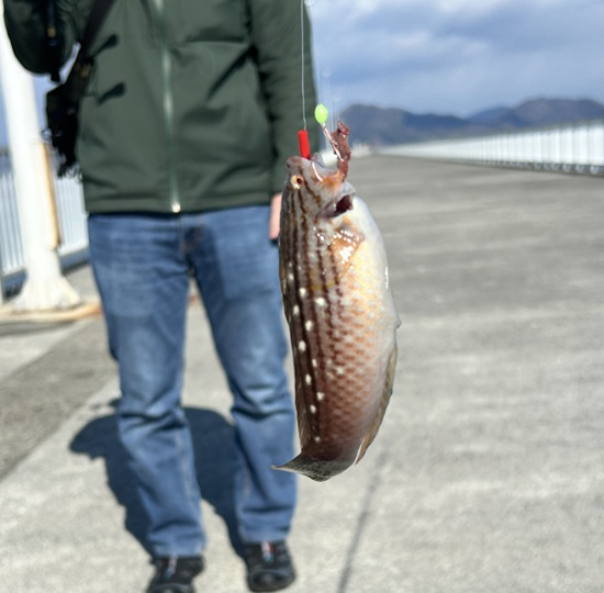 そして、またまた釣り上げたのはスタッフ小笠原。今度はベラをゲット。関東ではあまり食べられておりませんが、ここ瀬戸内海エリアでは「ギザミ」と呼ばれておりまして、昔から食用としても親しまれているお魚です。塩焼きやバターソテーにすると鱗を取らなくても食べることができまして、そのふっくらとした身が大変美味しいお魚です。わたしも夏にキス釣りをしているときなど、いいサイズのギザミが釣れたら持ち帰っております。