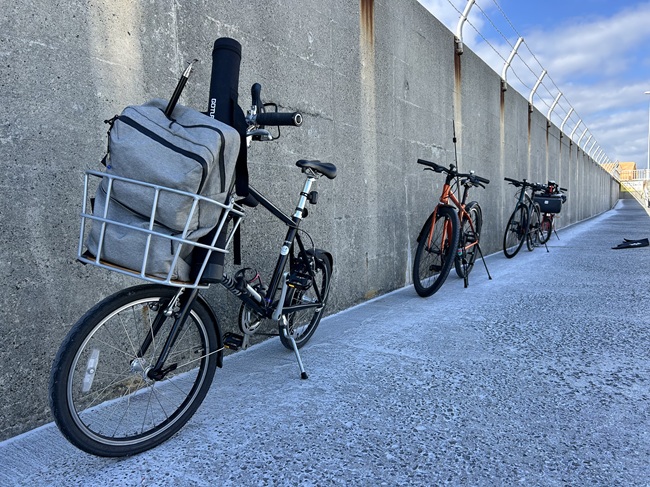 なお、今回のメンバーはそれぞれロードバイクを所有しておりますが、この日はクロスバイクとミニベロ、そしてフォールディングバイクに乗って現地入りしております。荷物が多いRide&Fishではキックスタンドとフラットペダル装備で汎用性の高い、街乗り系のクロスバイクやミニベロが活躍します。
