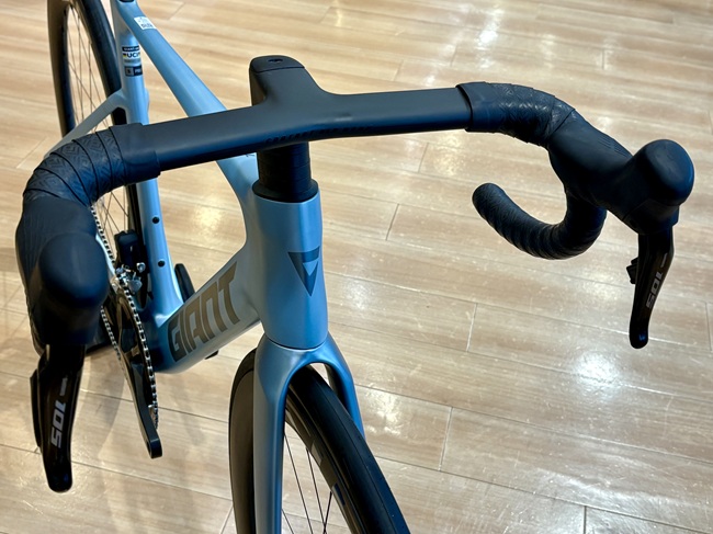 新型Propelでは、フロントフォーク、ヘッドチューブそしてハンドル周りと、空気抵抗に大きな影響を与える車体前方のデザインを総合的に最適化しています。こちらのハンドルバーですが、重量も非常に軽く仕上がっておりまして、もっとも幅の広い仕様(420mm)の製品で350gとなっています。