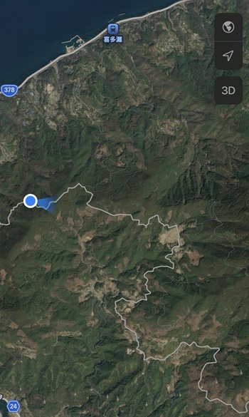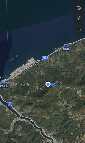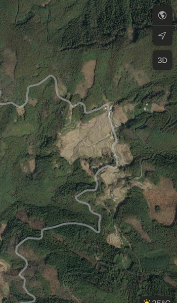 ひとまずどのあたりに棚田があるのか? マップのサテライト画像を確認してみますと…