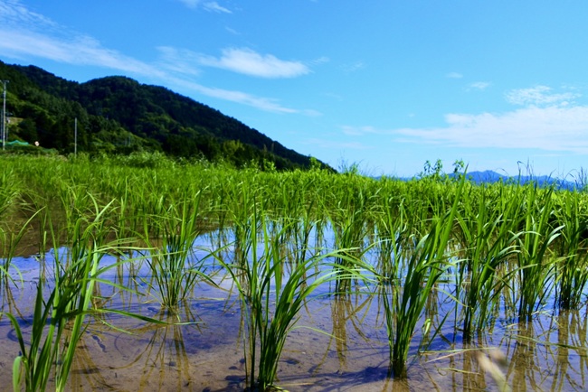 田んぼの畦による直線と曲線が山の景色に溶け込み、その素晴らしい風景に思わずため息が出てしまいます。
