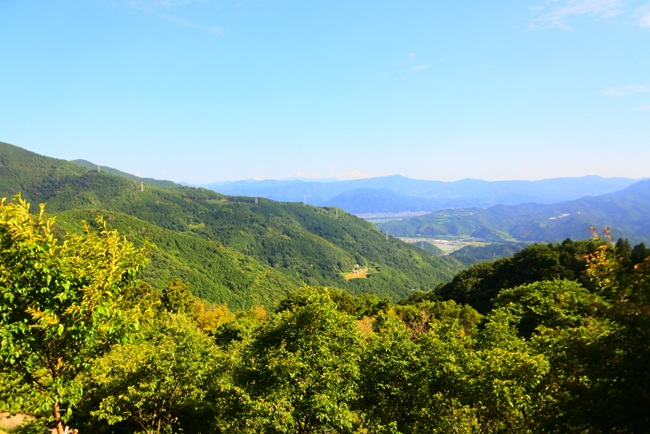 写真中央の奥に見えるのが大洲市街です。この先は左側に見える山を越えていきます。