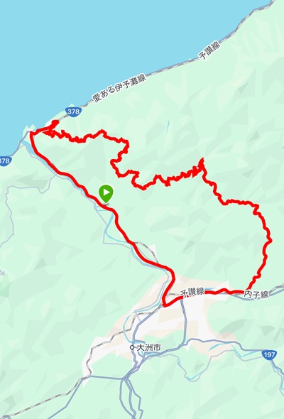 さてさて、早速ですが今回のサイクリングはこちら。愛媛県大洲市の肱川沿いに山道をドッキングした55kmのルートを走ってきました。もうマジで山だらけ。