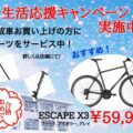 いよいよ春の新入学&新生活の季節となりました。 通勤通学用にお勧めのクロスバイク・マウンテンバイクの在庫をご案内いたします。 ESCAPEシリーズ、GRAVIERシリーズの在庫情報をお知らせいたします。 2026 NEW!! Escape RX 1 Disc ¥154,000(税込) color:マットチタニウム size: 430(XS)155-170cm 取り寄せ可能 465(S)160-175cm 店頭在庫◎ 500(M)170-185cm 取り寄せ可能 555(L)180-195cm 取り寄せ可能 Escape RX 2 Disc ¥118,800(税込) color:ブラックダイヤモンド size: 430(XS)155-170cm 取り寄せ可能 465(S)160-175cm 取り寄せ可能 500(M)170-185cm 取り寄せ可能 555(L)180-195cm 店頭在庫◎ color:マーキュリー size: 430(XS)155-170cm 取り寄せ可能 465(S)160-175cm 取り寄せ可能 500(M)170-185cm 店頭在庫◎ 555(L)180-195cm 取り寄せ可能 color:マットクリソコラ size: 430(XS)155-170cm 取り寄せ可能 465(S)160-175cm 店頭在庫◎ 500(M)170-185cm 取り寄せ可能 555(L)180-195cm 取り寄せ可能 Escape RX 3 ¥86,900(税込) color:マットグラファイト size: 430(XS)155-170cm 取り寄せ可能 465(S)160-175cm 取り寄せ可能 500(M)170-185cm 取り寄せ可能 555(L)180-195cm 取り寄せ可能 color:ユニコーンホワイト size: 430(XS)155-170cm 取り寄せ可能 465(S)160-175cm 取り寄せ可能 500(M)170-185cm 店頭在庫◎ 555(L)180-195cm 取り寄せ可能 color:オーシャントワイライト size: 430(XS)155-170cm 取り寄せ可能 465(S)160-175cm 店頭在庫◎ 500(M)170-185cm 取り寄せ可能 555(L)180-195cm 取り寄せ可能 color:サンセット size: 430(XS)155-170cm 取り寄せ可能 465(S)160-175cm 取り寄せ可能 500(M)170-185cm 取り寄せ可能 555(L)180-195cm 取り寄せ可能 Escape X ¥88,000(税込) color:マットブラック size: 380(XS)150-160cm 予約可能 430(S)160-170cm 取り寄せ可能 485(M)170-180cm 店頭在庫◎ 535(L)180-190cm 取り寄せ可能 585(XL)190-200cm 予約可能 color:マットデザートサンド size: 380(XS)150-160cm 取り寄せ可能 430(S)160-170cm 店頭在庫◎ 485(M)170-180cm 店頭在庫◎ 535(L)180-190cm 予約可能 585(XL)190-200cm 取り寄せ可能(残りわずか) Escape R E+ ¥297,000(税込) color:レッド、メタリックブラック、パールホワイト、シースパークル、クラッシックグリーン size: 430(XS)155-170cm 取り寄せ可能 465(S)160-175cm 取り寄せ可能 500(M)170-185cm 取り寄せ可能 570(L)180~200㎝ 取り寄せ可能 *レッド(M)は完売 Escape R3 ¥69,300(税込) color:マットブラック size: 430(XS)155-170cm 取り寄せ可能 465(S)160-175cm 取り寄せ可能 500(M)170-185cm 店頭在庫◎ 555(L)180-195cm 取り寄せ可能 color:パールホワイト size: 430(XS)155-170cm 取り寄せ可能 465(S)160-175cm 取り寄せ可能 500(M)170-185cm 取り寄せ可能 555(L)180-195cm 取り寄せ可能 color:メタリックブルー size: 430(XS)155-170cm 取り寄せ可能 465(S)160-175cm 取り寄せ可能 500(M)170-185cm 店頭在庫◎ 555(L)180-195cm 取り寄せ可能 color:クラッシックグリーン size: 430(XS)155-170cm 取り寄せ可能 465(S)160-175cm 取り寄せ可能 500(M)170-185cm 店頭在庫◎ 555(L)180-195cm 取り寄せ可能 color:マットモカブラウン size: 430(XS)155-170cm 取り寄せ可能 465(S)160-175cm 店頭在庫◎ 500(M)170-185cm 取り寄せ可能 555(L)180-195cm 店頭在庫◎ Escape R Disc ¥77,000(税込) color:マットグラファイト size: 430(XS)155-170cm 取り寄せ可能 465(S)160-175cm 取り寄せ可能 500(M)170-185cm 取り寄せ可能 555(L)180-195cm 取り寄せ可能 color:パールホワイト size: 430(XS)155-170cm 取り寄せ可能 465(S)160-175cm 取り寄せ可能 500(M)170-185cm 取り寄せ可能 555(L)180-195cm 取り寄せ可能 color:メタリックネイビー size: 430(XS)155-170cm 取り寄せ可能 465(S)160-175cm 取り寄せ可能 500(M)170-185cm 店頭在庫◎ 555(L)180-195cm 取り寄せ可能 Gravier ¥70,400(税込) color:サテンコールドアイアン size: 430(XS)155-170cm 取り寄せ可能 465(S)160-175cm 取り寄せ可能 500(M)170-185cm 店頭在庫◎ 555(L)180-195cm 取り寄せ可能 color:サテンケルプフォレスト size: 430(XS)155-170cm 取り寄せ可能 465(S)160-175cm 取り寄せ可能 500(M)170-185cm 取り寄せ可能 555(L)180-195cm 店頭在庫◎ color:マットチタニウム size: 430(XS)155-170cm 取り寄せ可能 465(S)160-175cm 取り寄せ可能 500(M)170-185cm 店頭在庫◎ 555(L)180-195cm 取り寄せ可能 Gravier Disc ¥78,100(税込) color:マットブラック size: 430(XS)155-170cm 取り寄せ可能 465(S)160-175cm 店頭在庫◎ 500(M)170-185cm 取り寄せ可能 555(L)180-195cm 取り寄せ可能 color:マットサンド size: 430(XS)155-170cm 取り寄せ可能 465(S)160-175cm 取り寄せ可能 500(M)170-185cm 店頭在庫◎ 555(L)180-195cm 取り寄せ可能 color:マットストーンブルー size: 430(XS)155-170cm 取り寄せ可能 465(S)160-175cm 店頭在庫◎ 500(M)170-185cm 取り寄せ可能 555(L)180-195cm 取り寄せ可能 Escape R W E+ ¥297,000(税込) color:ジェイドグリーン size: 375(XXS)145~160cm 店頭在庫◎ 445(XS)155-170cm 取り寄せ可能 color:ユニコーンホワイト size: 375(XXS)145~160cm 取り寄せ可能 445(XS)155-170cm 取り寄せ可能 color:マットダークシルバー size: 375(XXS)145~160cm 取り寄せ可能 445(XS)155-170cm 取り寄せ可能 Escape R3 W ¥69,300(税込) color:サテンパールホワイト size: 345(XXS)140-160cm 取り寄せ可能 400(XS)155-170cm 取り寄せ可能 440(S)160-175cm 取り寄せ可能 color:マットネイビー size: 345(XXS)140-160cm 取り寄せ可能 400(XS)155-170cm 店頭在庫◎ 440(S)160-175cm 取り寄せ可能 color:マットダスティピンク size: 345(XXS)140-160cm 取り寄せ可能 400(XS)155-170cm 取り寄せ可能 440(S)160-175cm 予約可能 Escape R 