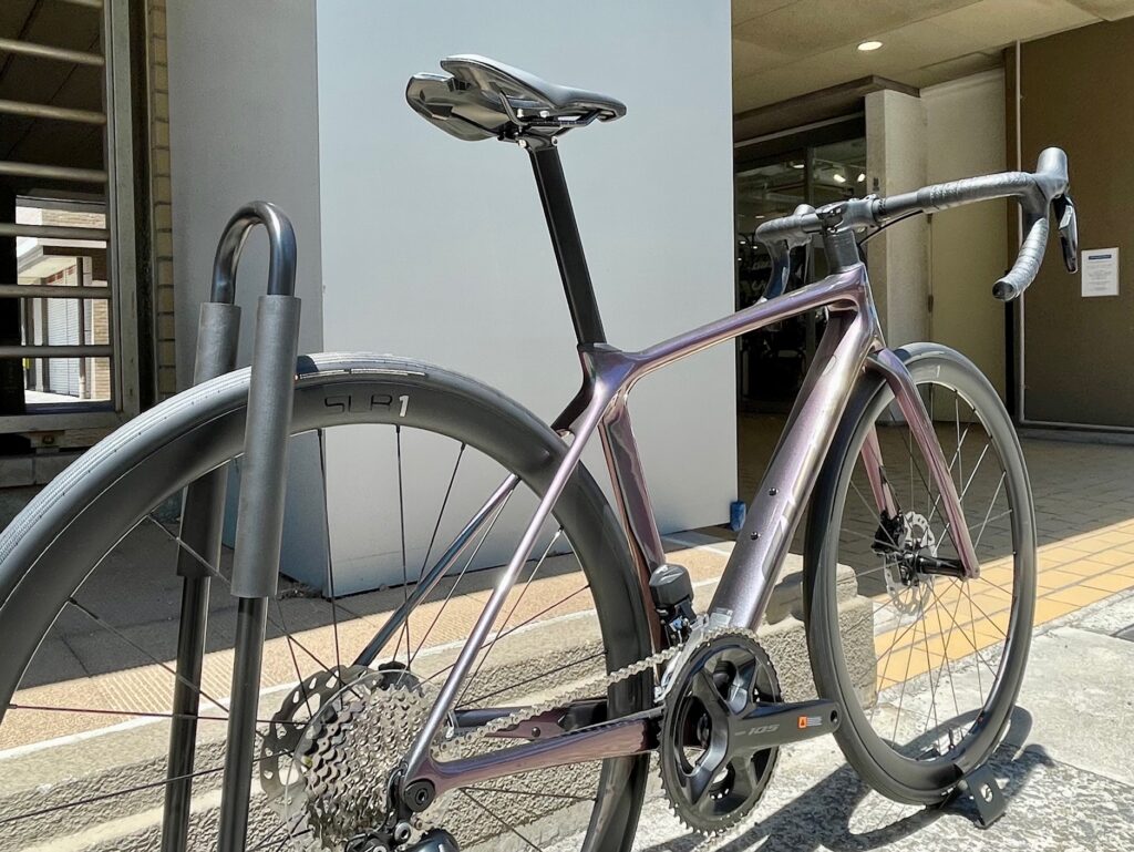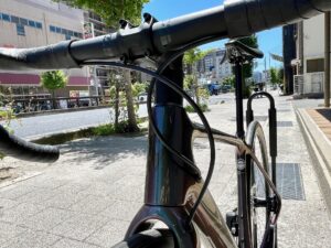 現行世代(2025モデル以降)のTCRのように完全内装式のケーブルルーティングではありませんが、ハンドル回りで露出しているのはブレーキホース2本のみです。