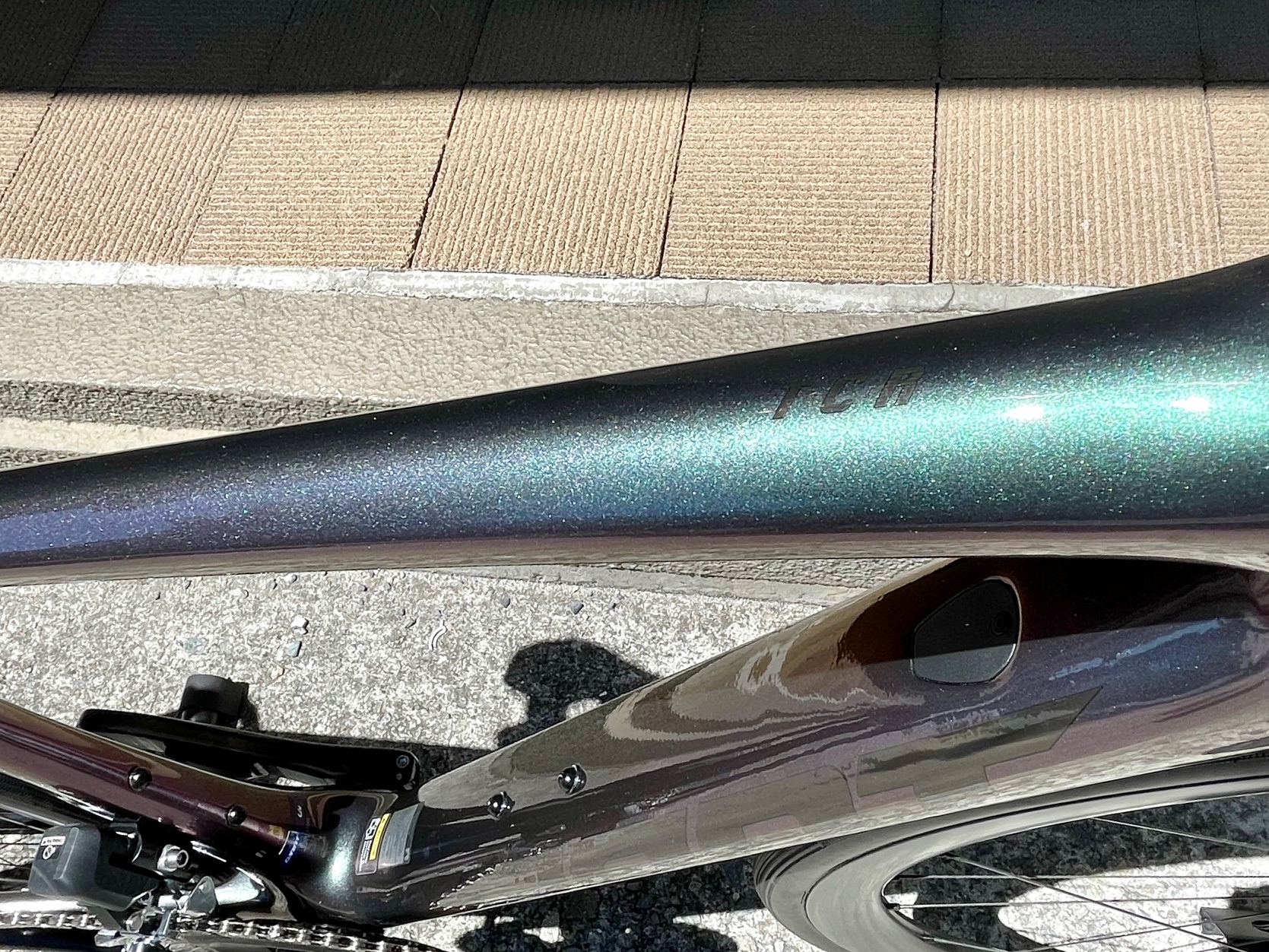現行世代(2025モデル以降)のTCRのように完全内装式のケーブルルーティングではありませんが、ハンドル回りで露出しているのはブレーキホース2本のみです。