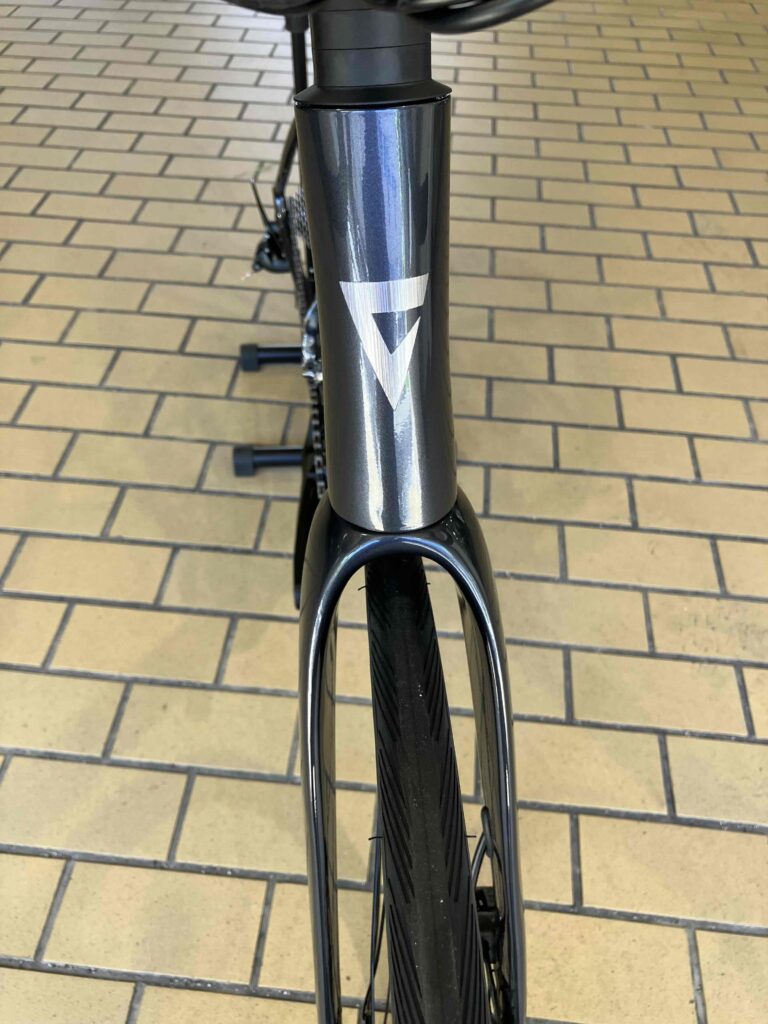 エアロフォルムのヘッド~ダウンチューブがフロントフォークと相まってシャープかつ迫力のあるルックスに。