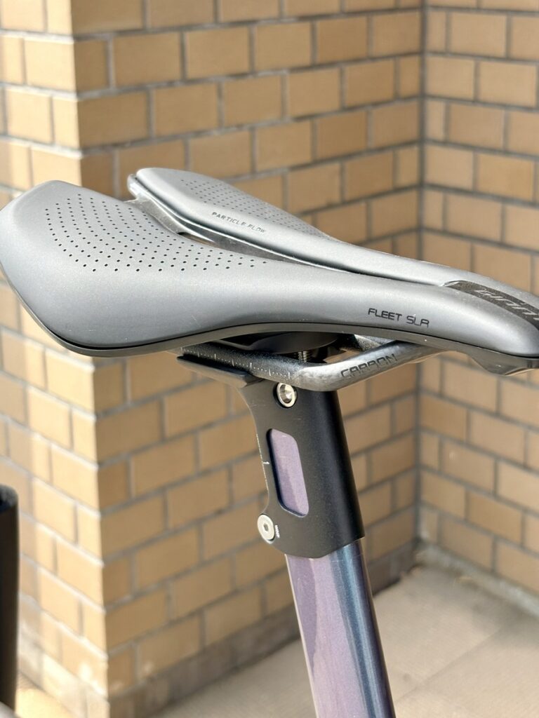 カーボンレールの「FLEET SLR」サドルやカーボンハンドル・カーボンステムが標準装備です。