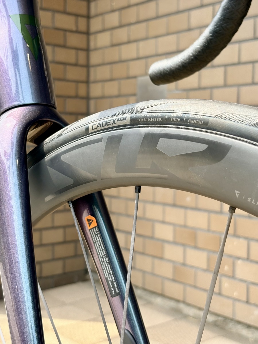40mmハイトの「SLR 0」ホイール(カーボンスポーク・カーボンリム)と 「CADEX Race」28Cタイヤ。