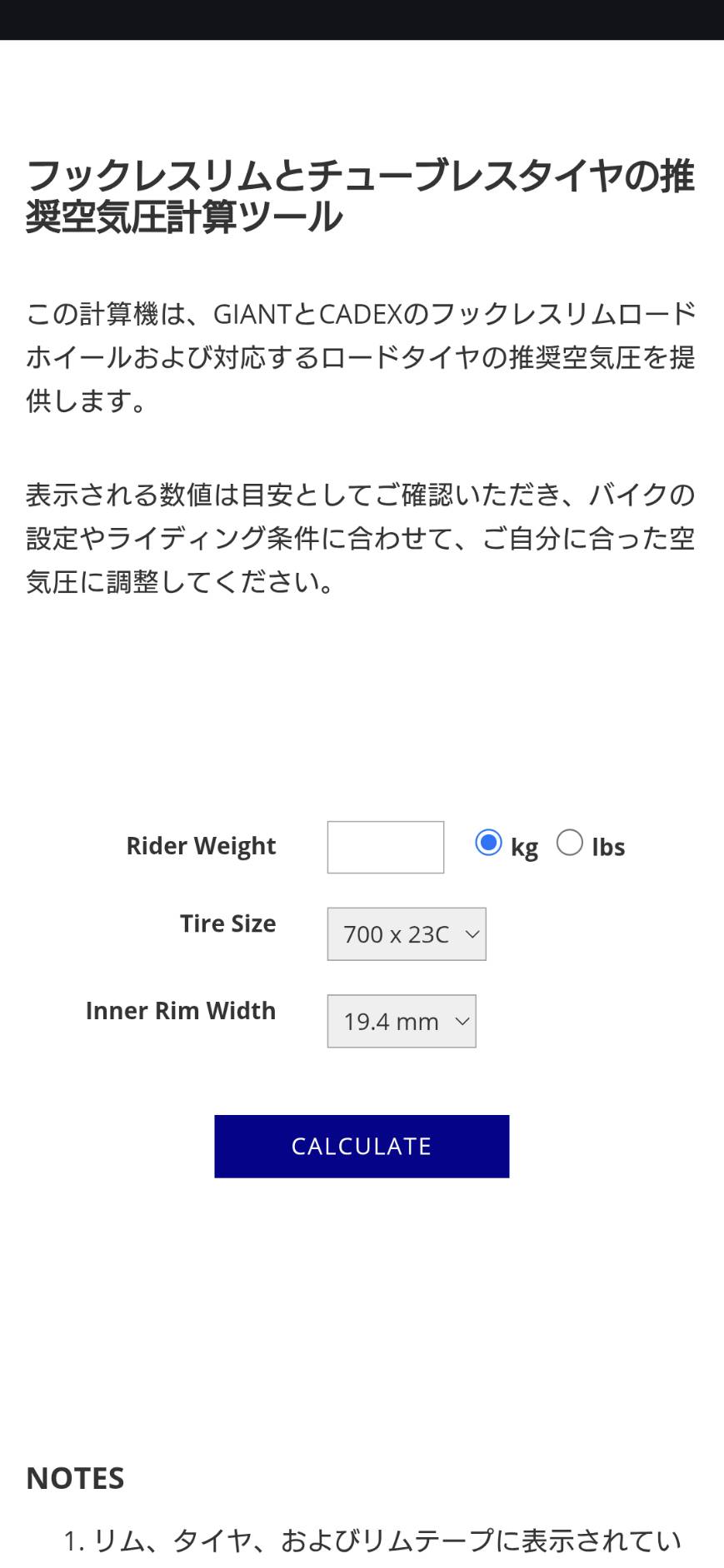 使い方は簡単、ページを下の方へスクロールして「体重」「タイヤサイズ」「リムの内幅」を入力すれば出てきます。