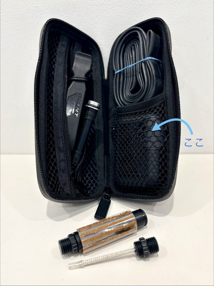 ちなみに、手前側に写っているのは、チューブレスタイヤ用のパンク修理キットです。必要なら、このキットも一緒に入ります。