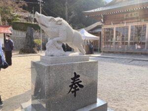 自転車を降りて階段を登っていくと、狛犬ではなく、狛いのししがお迎えしてくれます。