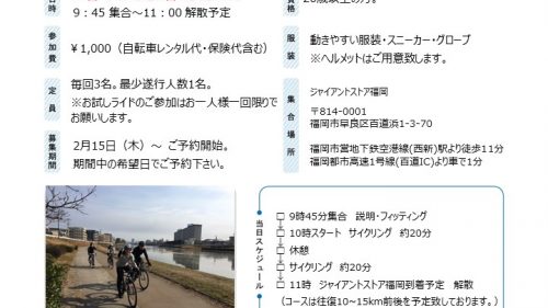 リブ/女性向け情報 仙台 2018/02/17 【Livフロアご紹介⑮】初めてのスポーツバイク必要なもの① ジャイアントストア仙台2階は 女性専用のLivフロアとなっております! &nbs・・・ 二子玉川 2018/02/17 【Liv】タイヤの太いクロスバイク【レディース】 皆さんこんにちは!ストア周辺でも メジロが飛んでいるのを見かけたりと、 少しずつ・・・ 川越 2018/02/16 Livトートバッグがもらえる!新作アパレルキャンペーン実施中♪ 今日はLivの嬉しいキャンペーンをご紹介いたします! 当店では、201・・・ 大阪 2018/02/16 「Liv」LIV PARADISA WIND JACKET 入荷しました! こんにちは! 今日は気温が高めで、日射しが当たると暖かかったですが まだやっ・・・ 福岡 2018/02/15 3月☆1週間ロードバイクお試しライド開催します☆ 3月8日~3月15日 「ロードバイクお試しライド」を開催します♪ ロードバイク・・・ 聖蹟桜ヶ丘 2018/02/15 冬のモーニングにオススメ!あったかスープカフェ◎ 毎朝寒くて寒くて、 布団から出るのも億劫な季節ですが ちょっと早起きして、 朝・・・ 板橋 2018/02/15 女性に乗ってほしいロード No.1 LANGMA ADVAMCED 2 展示再開しました! はじめてのスポーツ自転車を検討されている方は、よくこんなことをおっしゃいます。 ・・・ 今治 2018/02/15 GSCC&ClubLiv合同ライド 3/18(日) いちご狩り【募集】 こんにちは、スタッフ重兼です! まだまだ寒い日が続いていますが、 体・・・ 二子玉川 2018/02/15 Club Livライド*蒸しパン&たい焼きライドを開催しました♪ ご参加された皆様ありがとうございました!! 出発前に記念撮影! 駒沢公園から・・・ « 前の記事一覧へ 次の記事一覧へ »