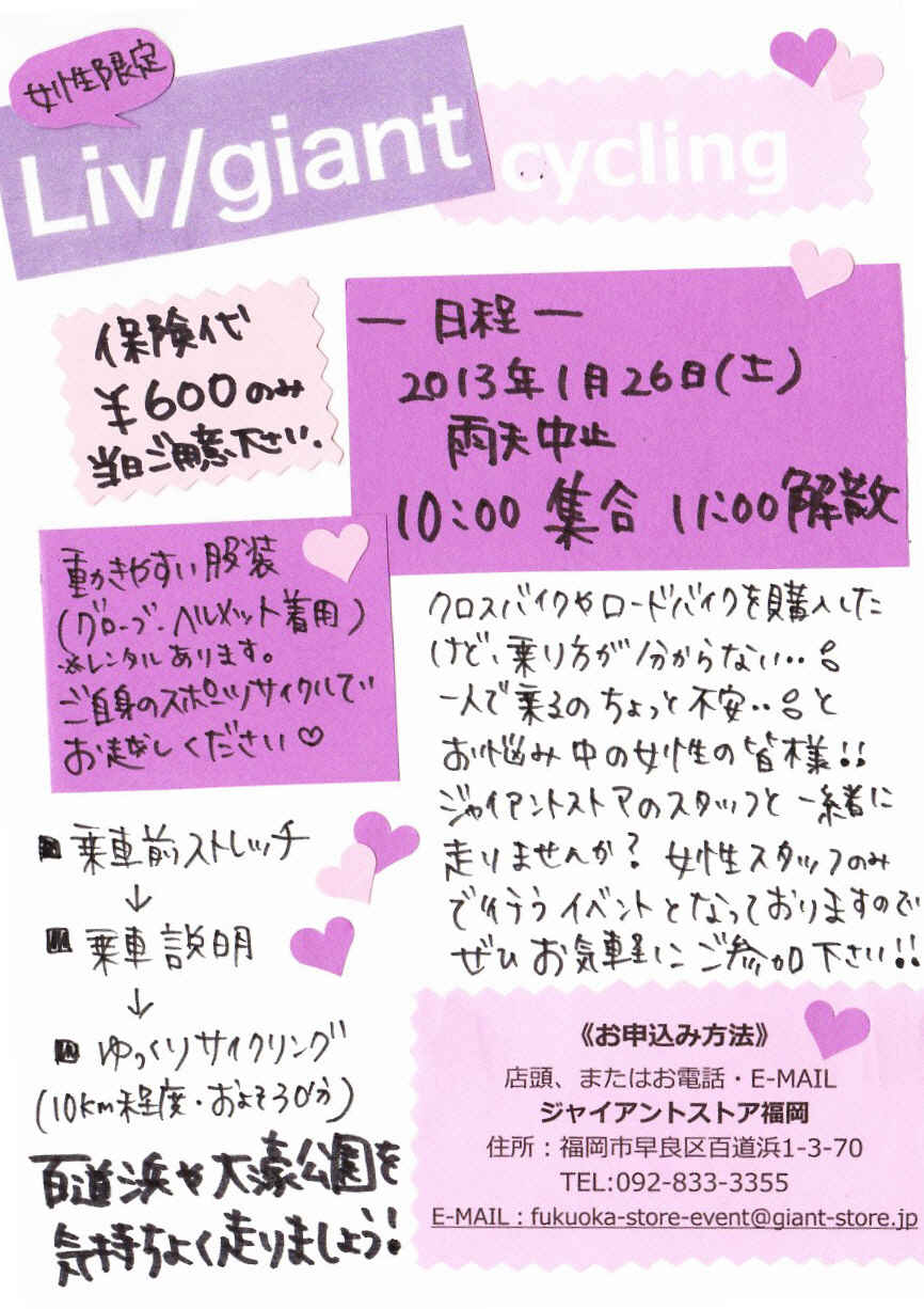 リブ/女性向け情報 福岡 2013/03/25 小柄な方に☆XXSサイズの在庫情報☆ ジャイアントの女性専用設計のスポーツバイク、「Liv」シリーズに・・・ 福岡 2013/02/22 FREEDA 入荷しました♪ リブ/ジャイアントシリーズ「FREEDA」の全3色が揃いました♪ ・・・ 福岡 2013/02/09 女子スタッフ珍道中~しまなみ海道~後編 前編をブログにUPして時間が随分経ってしまいましたが しまなみ海道の後半です! ・・・ 名古屋 2013/02/07 サイクルトレーナーを自分の部屋に 【サイクルトレーナーを自分の部屋に】 まだまだ寒い日が続きますね。 この・・・ 二子玉川 2013/02/03 女性限定♡目指せ!スタイルアップセミナー 女性限定イベントのお知らせです!! みんなで楽しくローラー台体験をして・・・ 二子玉川 2013/01/26 リブトモ試走おまけ 走るだけでない、リブトモ。 実は・・・・、試走の時、わたくし、ひとりこっそりと・・・ 福岡 2013/01/24 女性限定☆Liv/giantサイクリング開催します! 1/26(土曜日)女性限定”Liv/giant サイクリング” ♡明日1/25(金・・・ 目黒通り 2013/01/22 ☆IDIOM☆ 先日積もった雪もほとんど融けた今日この頃。 自転車に乗ってますかー? 日・・・ 二子玉川 2013/01/13 !!!発足!!! こんにちは! 最近寒い日々が続いてますね…(>_<) ついつ・・・ « 前の記事一覧へ 次の記事一覧へ »