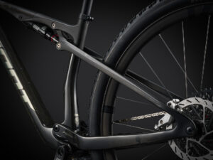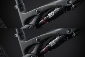 シートチューブに配置されることの多いリンク駆動シングルピポットシステムをトップチューブ下に収め、カーボン製スイングアーム、コンポジット製上側ロッカーアームを採用し、極限まで軽量化。