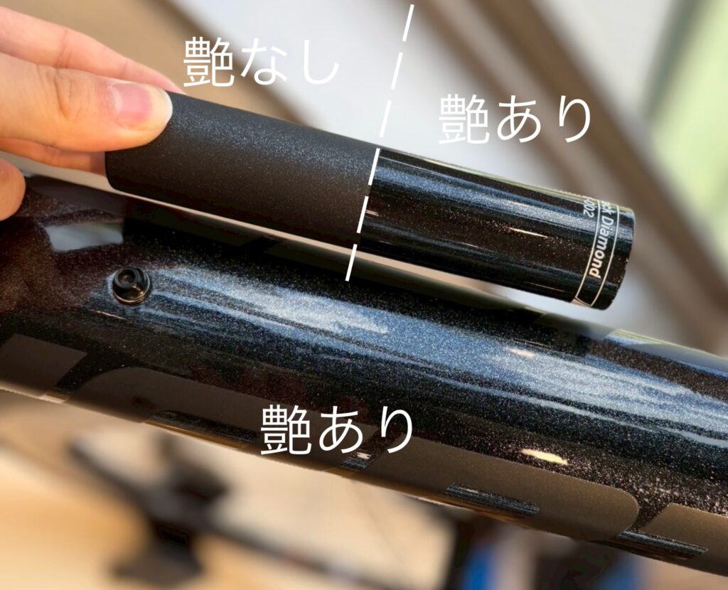 カラーサンプルでみると黒い印象が強いが、実際の自転車になると面積が広くなり、ラメの印象の方が強く見えます。