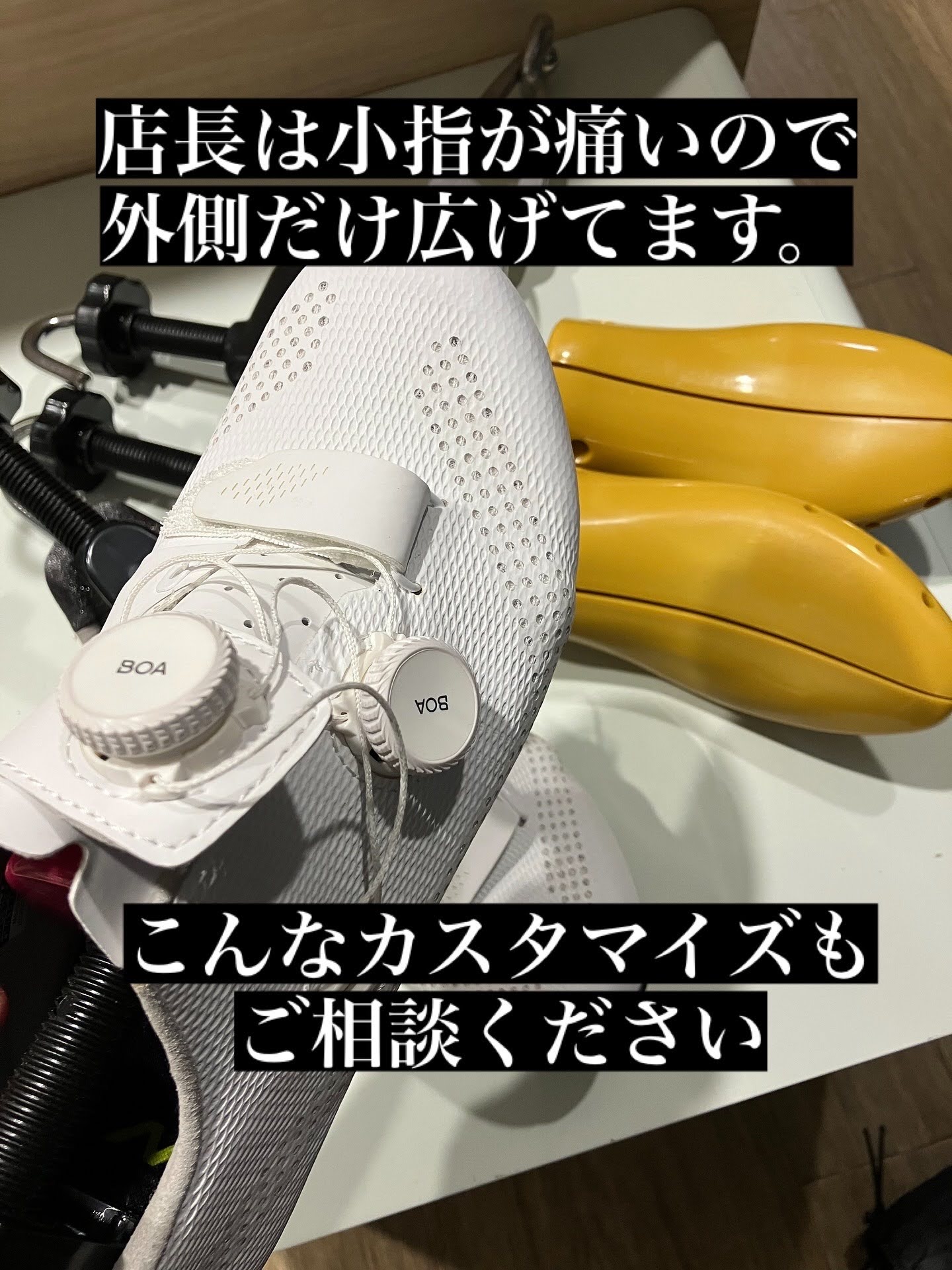 当店でシューズをお買い上げいただいた方には、シューズストレッチャー等を用いた「微調整サービス」(有料1,100円)を行っています。物理的にシューズをわずかに拡張し、あなたの足の形にフィットするよう丁寧に仕上げます。