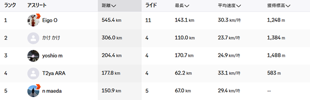 ・ロングライド賞中間トップ5(期間中トータル距離)