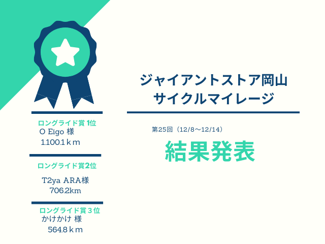 「第25回 ジャイアントストア岡山 サイクルマイレージ」の結果発表です。2025年12月15日