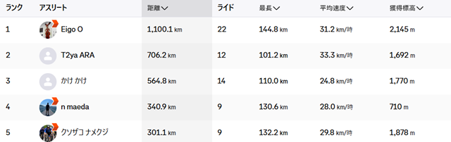 優勝のEigo Oさんは、1週間で1100キロ越えすごいです!