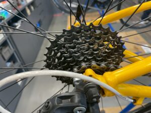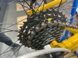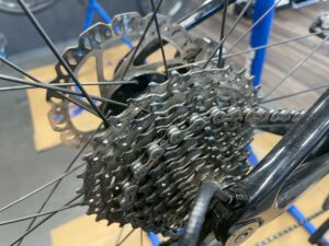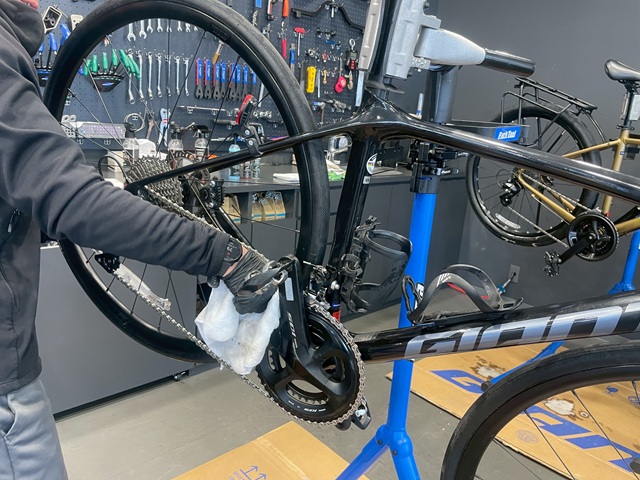 チェーン、カセットスプロケット、ディレイラー、クランクとオイルがついているところをきれいにします。