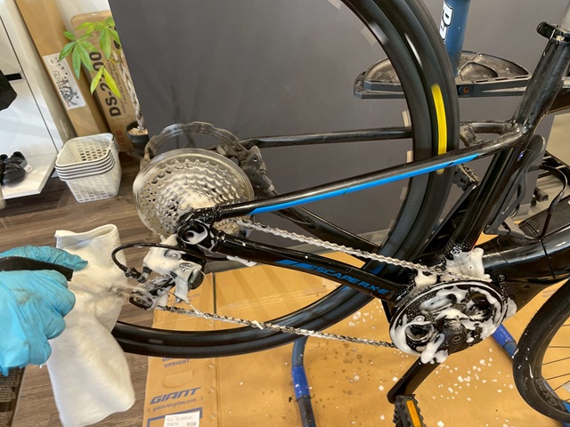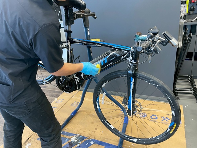 フレームやホイールにスプレーし、汚れをしっかり浮かせていきます。