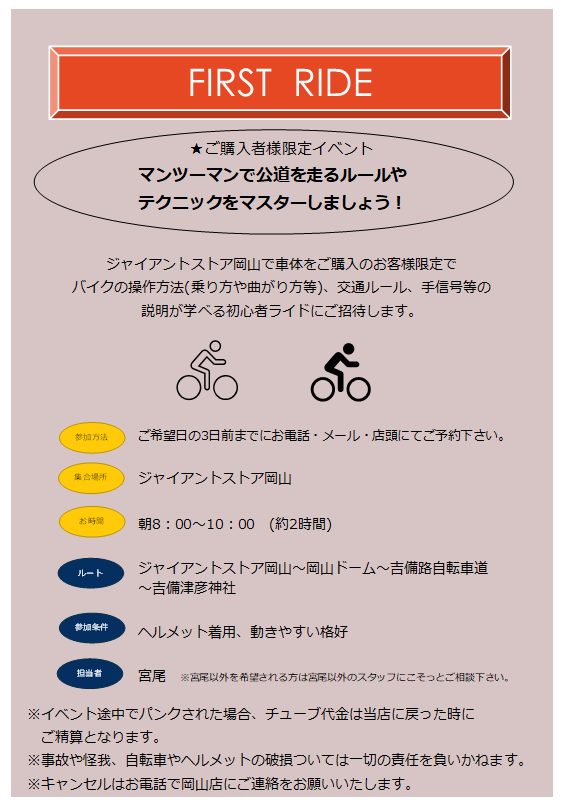 当店でご購入いただきましたお客様限定の初心者ライドセミナーです。