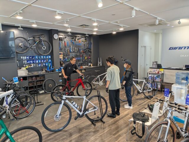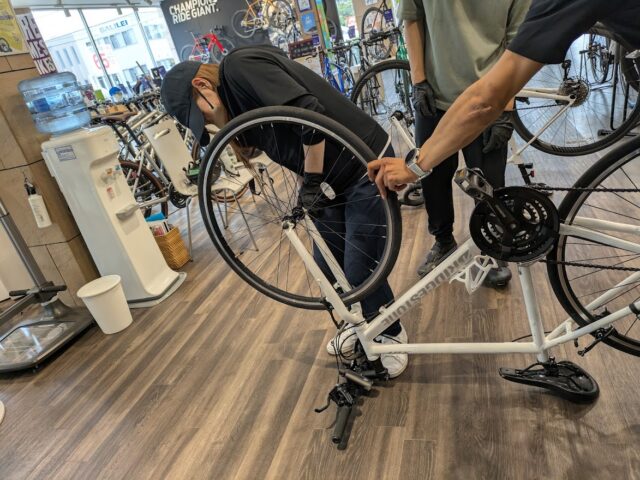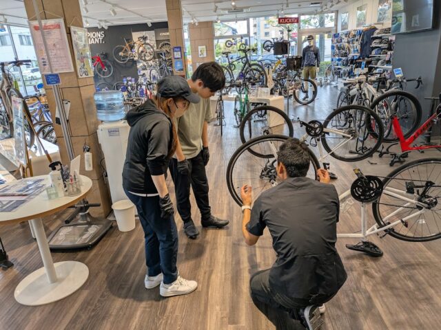 スタッフがやっているのを見ていただき、そのあと実際にご自分の自転車でやっていただきます。