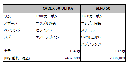 特に使用しているカーボンが異なるため、CADEX 50 ULTRAの方が乗った感じの剛性感は高いです。