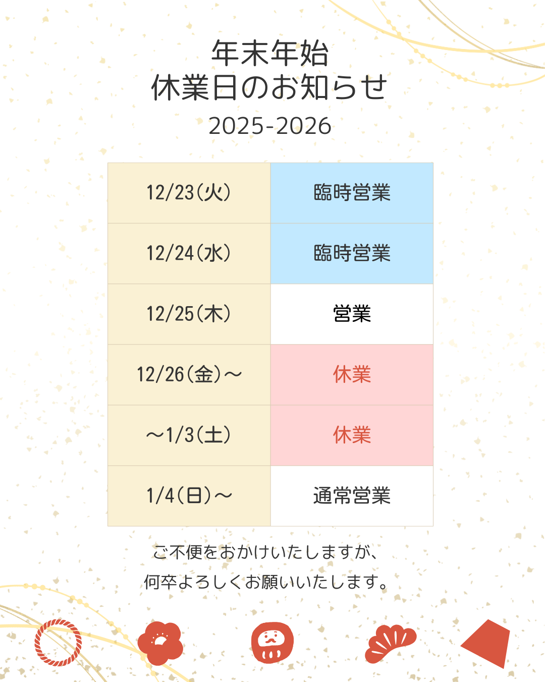 年末年始の営業スケジュールのお知らせ2025年12月19日