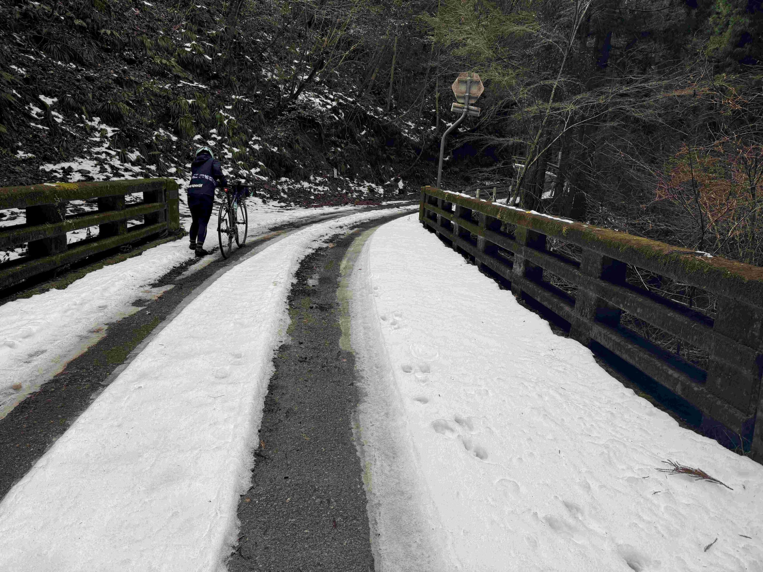 軽量バイクのおかげで、15%以上の勾配を何とかゆっくりと登り、更に進んでいくと路面が雪で凍結していて、途中からは自転車を押して登りました。