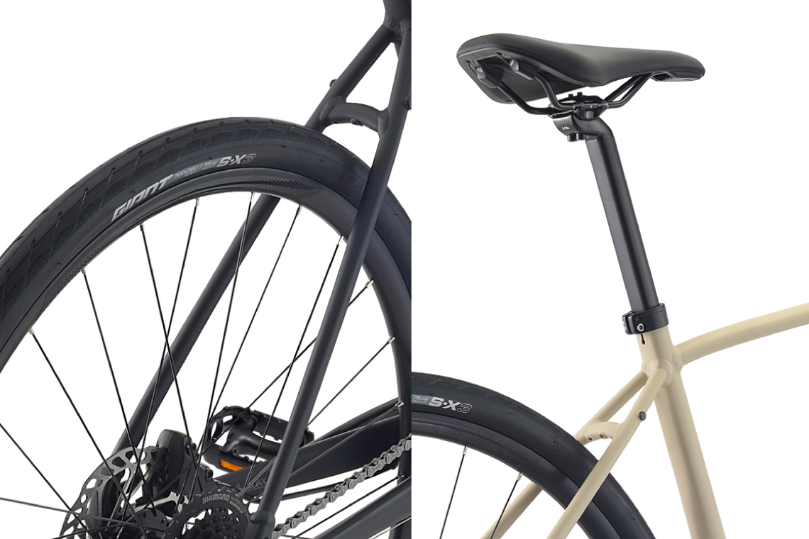 ▲左:シリーズ最大となる38mm幅タイヤを採用 / 右:路面からの衝撃を緩和するGIANT独自の「D-Fuse」シートポスト