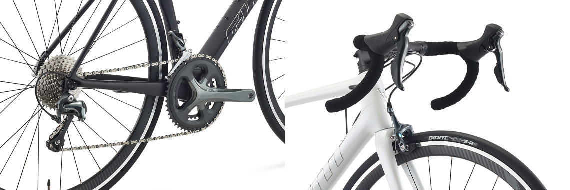 最新のトレンドと高い実用性を兼ね備えたコンポーネントも、Contend SLの大きな魅力です。振動吸収性に優れるAdvancedグレードのカーボンフォークは、快適な乗り心地と正確なコントロール性能を提供。最大32mm幅に対応するタイヤクリアランスにより、幅広いタイヤ選択が可能です。さらに、GIANT独自のALP(Aluminum Lightweight Performance)アルミ製ホイールは、30mmハイトのリムを軽量かつ堅牢に仕上げ、敏捷な操作性と耐久性を両立。人間工学に基づいて設計されたフレアハンドルバーは、トップ、フード、ドロップのどのポジションでも快適かつ安定したグリップを実現し、特に7.2度のフレア形状をもつドロップ部分は、下りやコーナリングでの安心感を高めます。これらの装備により、「Contend SL」は幅広いライドシーンで頼れるパートナーとなっています。